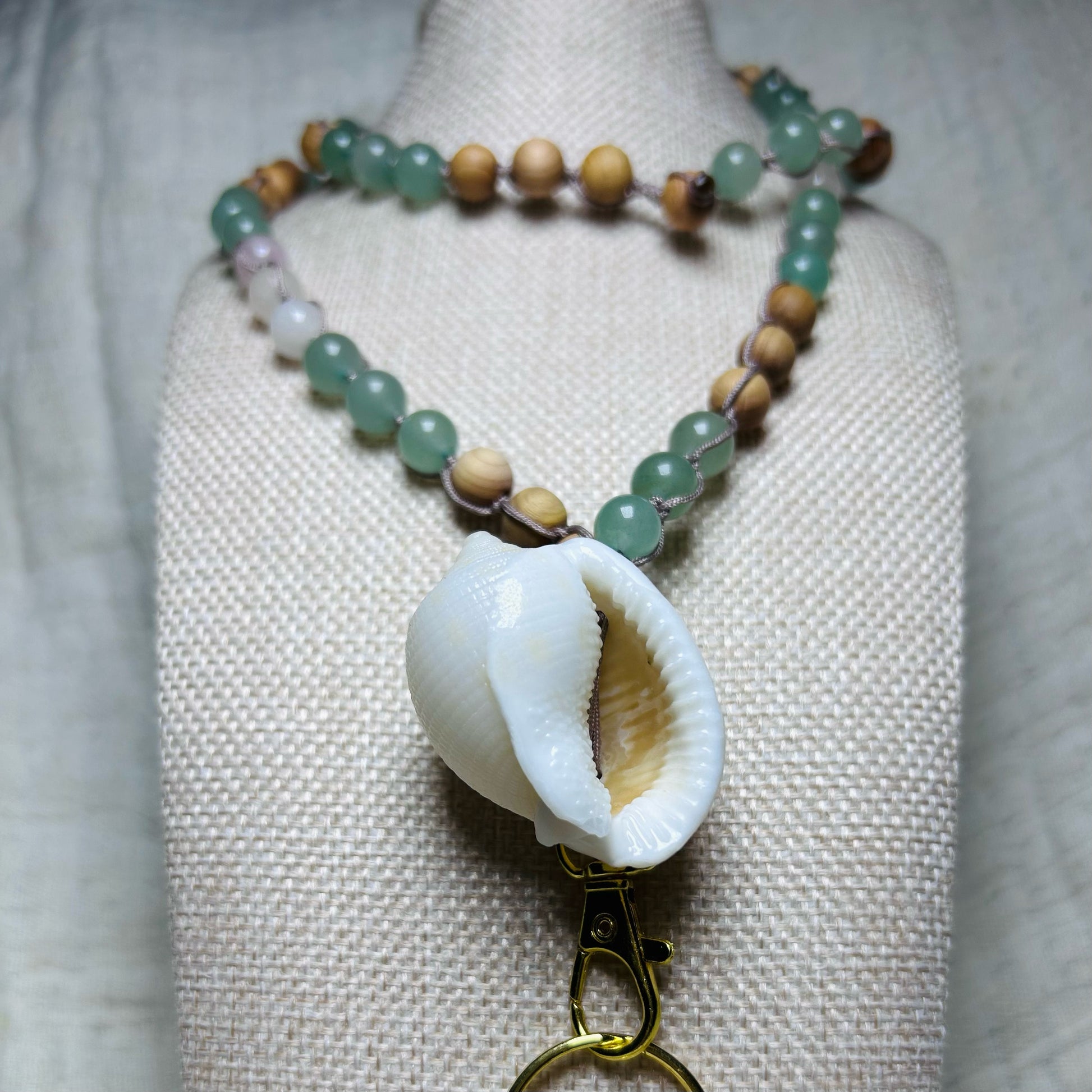 Bring the ocean to the office with this comfortable lanyard. This piece features a beautiful scotch bonnet shell found on Jupiter Island, Florida. A combination of stone and wood beads are woven together with a macrame knotted cord. This piece is durable and has a strong lobster clasp to hold all the things.